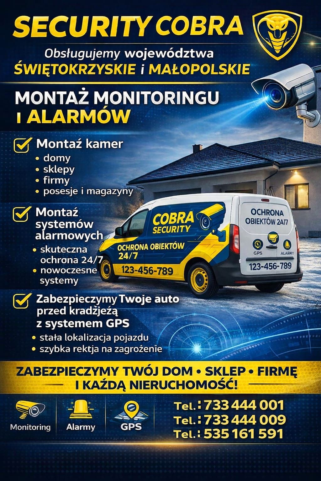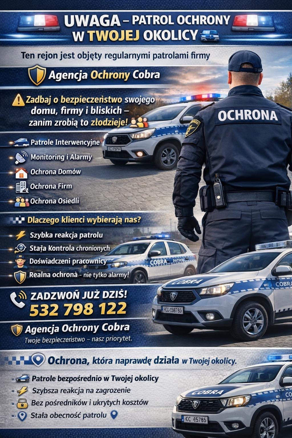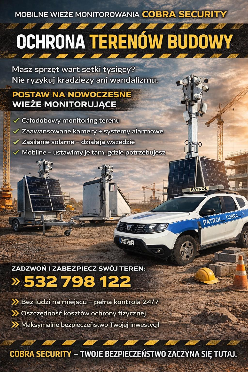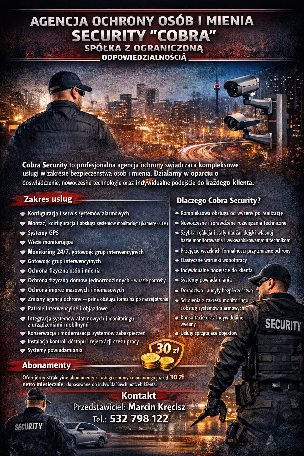 Grupa COBRA - Ochrona, monitoring i systemy alarmowe W ramach prowadzonej działalności zajmujemy się ochroną fizyczną obiektów, osób oraz projektujemy i instalujemy elektroniczne systemy antywłamaniowe, przeciwpożarowe, systemy powiadamiające i przywołujące Grupy Interwencyjne, zewnętrzne lub wewnętrzne systemy telewizji przemysłowej, systemy kontroli dostępu, wideofony, radiofonizację i nagłośnienie, oraz inne systemy służące ochronie osób i mienia – to wszystko sprawia również, że jesteśmy w stanie sprostać wymaganiom jakie stawia ochrona imprez masowych. Posiadamy koncesję MSWiA na fizyczną i techniczną ochronę mienia, osób i konwojowanie gotówki oraz inne wymagane w tym przypadku uprawnienia. Zatrudniamy wysoko wyspecjalizowanych pracowników z wieloletnim doświadczeniem, posiadających wszystkie niezbędne uprawnienia do ochrony osób i mienia, zarówno fizycznej jak i technicznej. Instalacja systemów alarmowych Instalacja systemów alarmowych to ważny element zapewnienia bezpieczeństwa dla każdego obiektu, czy to domu, firmy czy budynku publicznego. Dzięki zastosowaniu nowoczesnych technologii, systemy alarmowe są coraz bardziej skuteczne i łatwe w obsłudze, co pozwala na szybkie wykrycie i zareagowanie na wszelkie zagrożenia. Wybór odpowiedniego systemu alarmowego jest kluczowy dla jego prawidłowego funkcjonowania. Dlatego warto skorzystać z usług specjalistów, którzy pomogą w doborze odpowiedniego sprzętu oraz wykonają profesjonalną instalację. Agencja Ochrony Cobra oferuje kompleksowe usługi w zakresie projektowania i montażu systemów alarmowych, dostosowanych do indywidualnych potrzeb klienta. Ochrona fizyczna Ochrona stacjonarna obiektów jest podstawową usługą oferowaną przez naszą firmę. Ochraniamy duże zakłady przemysłowe, obiekty biurowe, magazynowe i handlowe. Przy realizacji zadań ochrony wykorzystujemy w szerokim zakresie systemy nadzoru nad pracownikami ochrony, łączność radiową, sprawdzone procedury postępowania w sytuacjach zagrożenia, wielowarstwowe kontrole. Dzięki temu ochrona fizyczna oraz powierzonego naszemu zespołowi mienia może przebiegać w pełni sprawnie i elastycznie dostosowywać się do wymogów stawianych przez klienta. Video monitoring Monitoring jest nowoczesnym, sprawdzonym i najtańszym sposobem ochrony posiadanego mienia. Pozwala skutecznie zabezpieczyć cały obiekt lub dowolnie wskazane pomieszczenie. Polega na podłączeniu zainstalowanego w budynku systemu alarmowego z niezależnym od niego Centrum Monitoringu. W Centrum prowadzona jest ciągła i aktywna obserwacja stanu elektronicznych zabezpieczeń zainstalowanych w chronionym obiekcie. Odbierany i zapisywany jest każdy sygnał, sygnały o napadzie, kradzieży, włamaniu, lub jakiejkolwiek próbie uszkodzenia systemu alarmowego są natychmiast sprawdzane. Prawidłowo skonstruowany system monitoringu pozwala również na wyeliminowaniu luk w zabezpieczeniach podczas ochrony imprez masowych na dużym, otwartym terenie. Ochrona techniczna Firma realizuje systemy zabezpieczenia elektronicznego na bazie standardowych urządzeń występujących na polskim rynku, a także systemy wymagające zastosowania urządzeń specjalistycznych. Posiadamy doświadczenie w montażu systemów ochrony wizyjnej (telewizja przemysłowa) z wykorzystaniem pełnej automatyki i sterowania oraz cyfrowej obróbki sygnałów wizyjnych. Specjalizujemy się również w wykonawstwie i dostawie urządzeń do systemów nagłośnieniowych i radiowęzłowych dla potrzeb dużych obiektów handlowych , obiektów wystawowych , zakładów produkcyjnych, hotelowych . Proponujemy kompleksowe wykonawstwo systemów przeciwpożarowych w oparciu o większość oferowanych w Polsce nowoczesnych systemów adresowalnych. W przypadku wykonawstwa systemów przeciwpożarowych wykonujemy również prace związane zatwierdzeniami projektów do realizacji. Wynajem Wież do Monitoringu – Mobilne Rozwiązania CCTV Poszukujesz skutecznego i elastycznego rozwiązania zabezpieczającego? Wynajem wież do monitoringu to nowoczesna alternatywa dla tradycyjnej ochrony fizycznej, oferująca do 70% oszczędności przy zachowaniu najwyższej skuteczności ochrony. Nasze mobilne wieże monodobowy nadzór nad Twoim obiektem bez konieczności budowy stałej infrastruktury. Mobilne maszty do monitorowania stanowią rewolucyjne rozwiązanie dla firm i instytucji wymagających szybkiego wdrożenia systemu bezpieczeństwa. Dzięki zaawansowanej technologii i pełnej autonomii energetycznej, wieże do monitoringu mogą być uruchomione nawet w ciągu 24 godzin od złożenia zamówienia