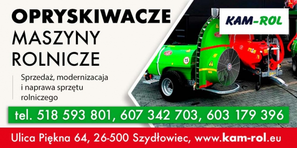 KAM-ROL Sprzedaż, modernizacja i naprawa sprzętu rolniczego to firma o profilu produkcyjno-handlowo-usługowym. Siedziba przedsiębiorstwa znajduje się w województwie mazowieckim : gmina Szydłowiec. Firma została założona w 2010 r. Na początku roku 2023 została przeniesiona do nowej siedziby: Szydłowiec, ul. Piękna 64. Działalność przedsiębiorstwa oparta jest w całości na polskim kapitale. Jej specjalność stanowią opryskiwacze sadownicze i polowe, kosiarki sadownicze, a także części do opryskiwaczy. Dostarczamy opryskiwacze na całą Polskę. Zajmujemy się również naprawą opryskiwaczy. Działalność firmy obejmuje teren całej Polski oraz kraje zagraniczne. Naszym priorytetem jest zapewnienie jak najwyższej jakości produkowanych wyrobów. Wprowadzając nowoczesne technologie i innowacje, stale udoskonalamy metody produkcji. Opryskiwacze sadownicze oferujemy również z przystawkami kolumnowymi przeznaczonymi do roślin jagodowych, a także do niskich i wysokich drzew. Wykorzystujemy technologie malowania proszkowego lub cynkowania ogniowego, które podnoszą odporność konstrukcji na korozję. Opryskiwacze spełniają europejskie wymogi bezpieczeństwa i posiadają ważne badania zgodnie z obowiązującymi przepisami. Realizujemy programy i wnioski unijne.