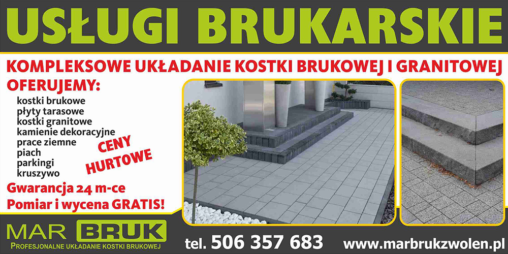 Firma MAR-BRUK świadczy profesjonalnie usługi brukarskie. Działamy na terenie województwa mazowieckiego, świętokrzyskiego, lubelskiego. Specjalizujemy się w kompleksowym układaniu kostki brukowej oraz granitowej. Wykonujemy również drogi,place,parkingi, chodniki,tarasy,wjazdy,schody.Mamy do zaoferowania szeroki wybór kostki brukowej najwyższej klasy oraz atrakcyjne i konkurencyjne ceny Nasza firma posiada duże doświadczenie w wykonywaniu swoich usług które sa poparte referencjami wielu firm oraz inwestorów prywatnych.Naszym atutem jest również profesjonalne i nowoczesne zaplecze techniczne oraz wykwalifikowani pracownicy co pozwala nam sprostać nawet najbardziej trudnym zleceniom Dzięki wieloletniemu doświadczeniu jakie posiada nasza firma i nasi pracownicy mogą Państwo liczyć na fachowe doradztwo z naszej strony oraz pomoc w wielu kwestiach związanych ze zleceniem. Przekażemy Państwu również pomocne informacje na temat czyszczenia,pielęgnacji i konserwacji kostki brukowej. Zapraszamy do sprawdzenia jakości naszej firmy. Kompleksowe układanie kostki brukowej i granitowej Oferujemy: kostki brukowe płyty tarasowe kostki granitowe kamienie dekoracyjne prace ziemne piach parkingi kruszywo Gwarancja 24 miesiące Pomiar i wycena gratis